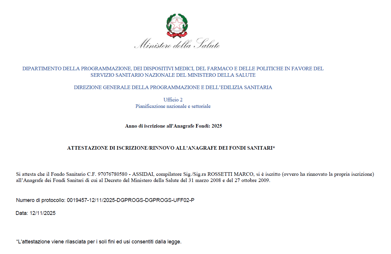 Nel settembre 2012, Assidai ha ottenuto dal Ministero della Salute, con numero di protocollo 0023588-25/09/2012-DGPROGS-DGPROGS-UFF05-P il rinnovo dell’iscrizione all’Anagrafe dei Fondi Sanitari per l’anno 2012 ai sensi dell’articolo 51, comma 2 lettera a) del Decreto del Presidente della Repubblica 22 dicembre 1986, n. 917 e successive modificazioni.
