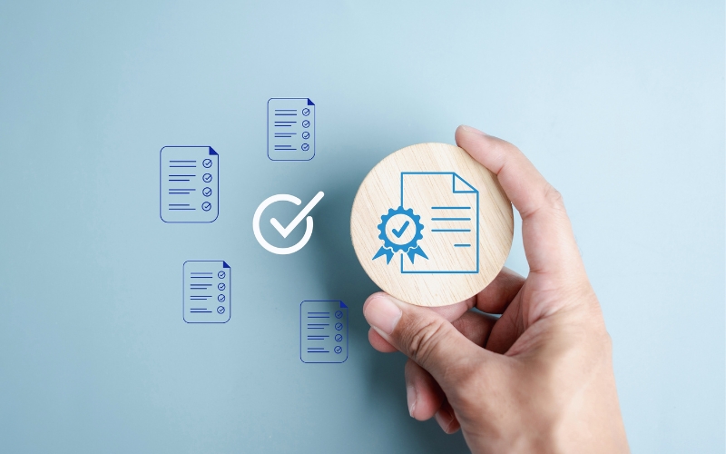 Una mano che tiene un cerchio di legno con un certificato e un timbro digitale blu, circondato da icone di documenti e una spunta (check mark), che simboleggia l'iscrizione all'Anagrafe dei Fondi Sanitari.